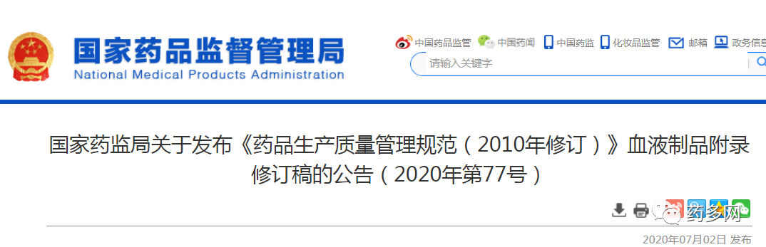 国药局发布《药品生产质量管理规范》血液制品修订的公告
