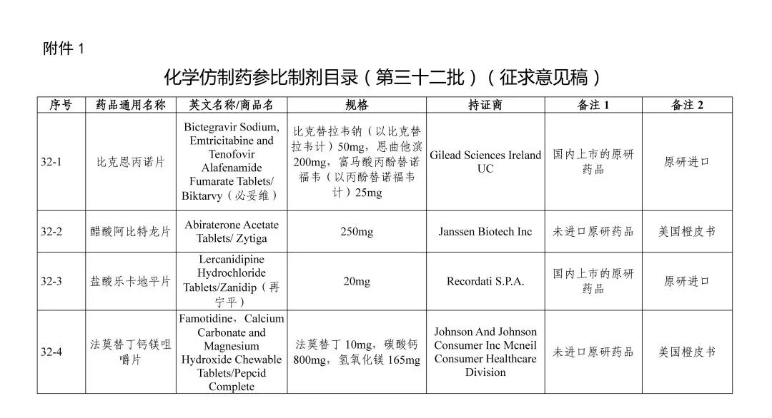 8月5日,CDE发布《化学仿制药参比制剂目录(第三十二批)》的公示。